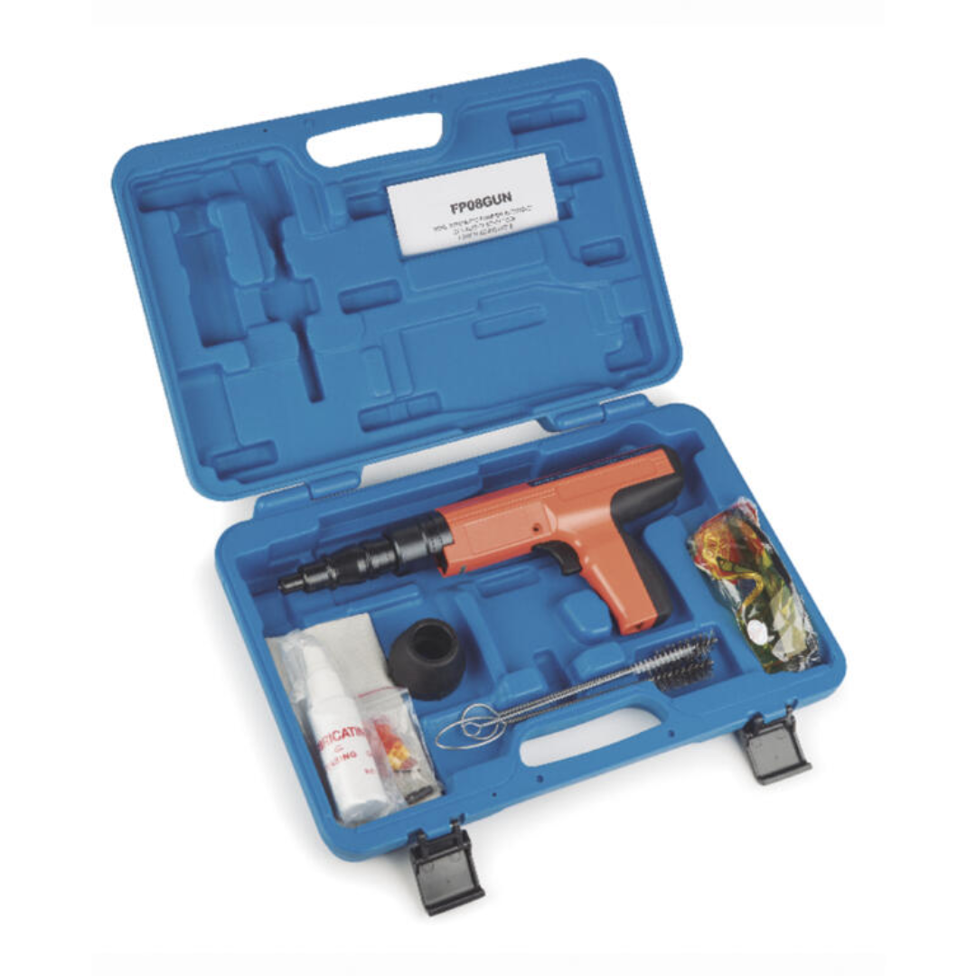 Pistola semiautomática a pólvora, con pistón y regulador de potencia. Permite una fijación rápida y precisa de clavos de 8 mm sobre materiales como hormigón o metal. Ofrece un bajo retroceso y cuenta con un silenciador incorporado.